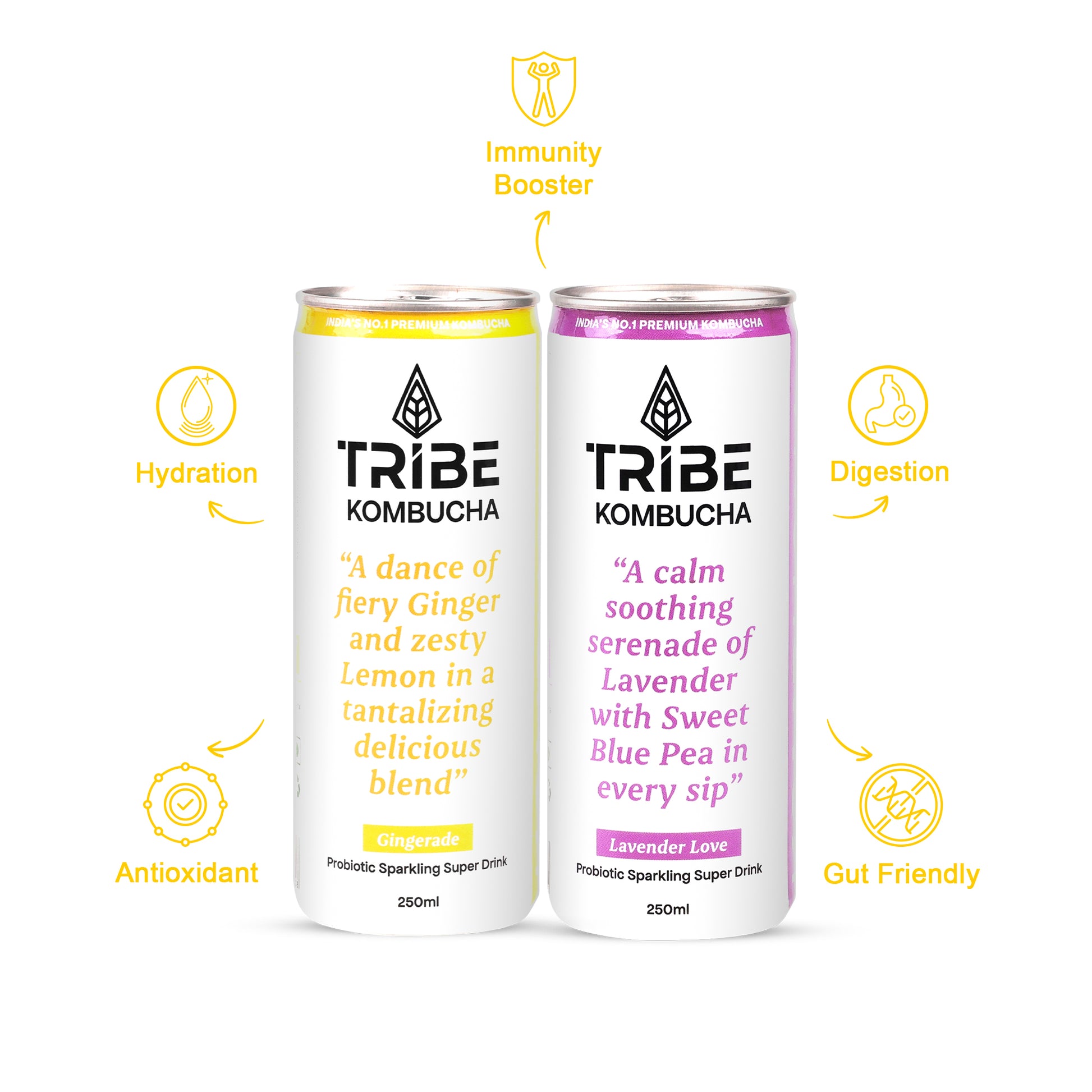 Tribe Kombucha Probiotic Super Drink | Supports Gut Health | Gluten-Free | Naturally Fermented | Super Refreshing | | Gluten free | Antioxidant and Hydration | Gingerade and Lavender| ack of 24 |250 ML